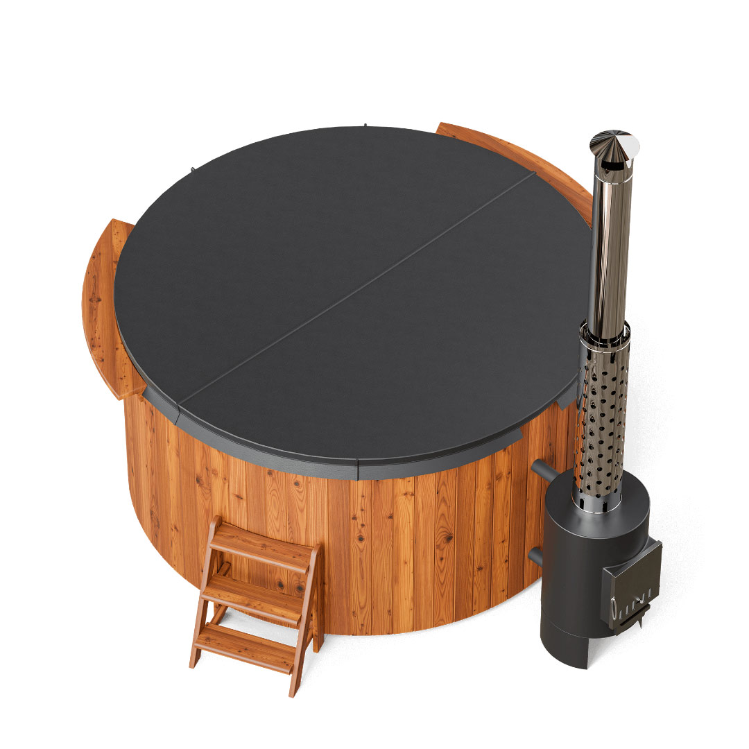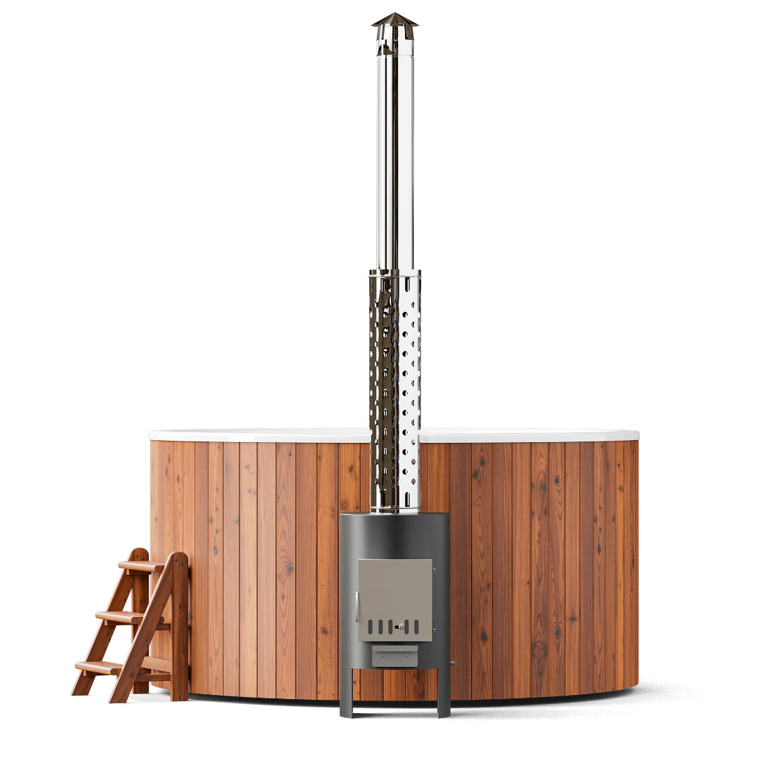 Kompaktowa konstrukcja z wbudowanym piecem na drewno o mocy 35 kW pozwala szybko nagrzać wodę i utrzymać jej temperaturę nawet w chłodne dni. Brak zewnętrznych elementów grzewczych oszczędza miejsce.