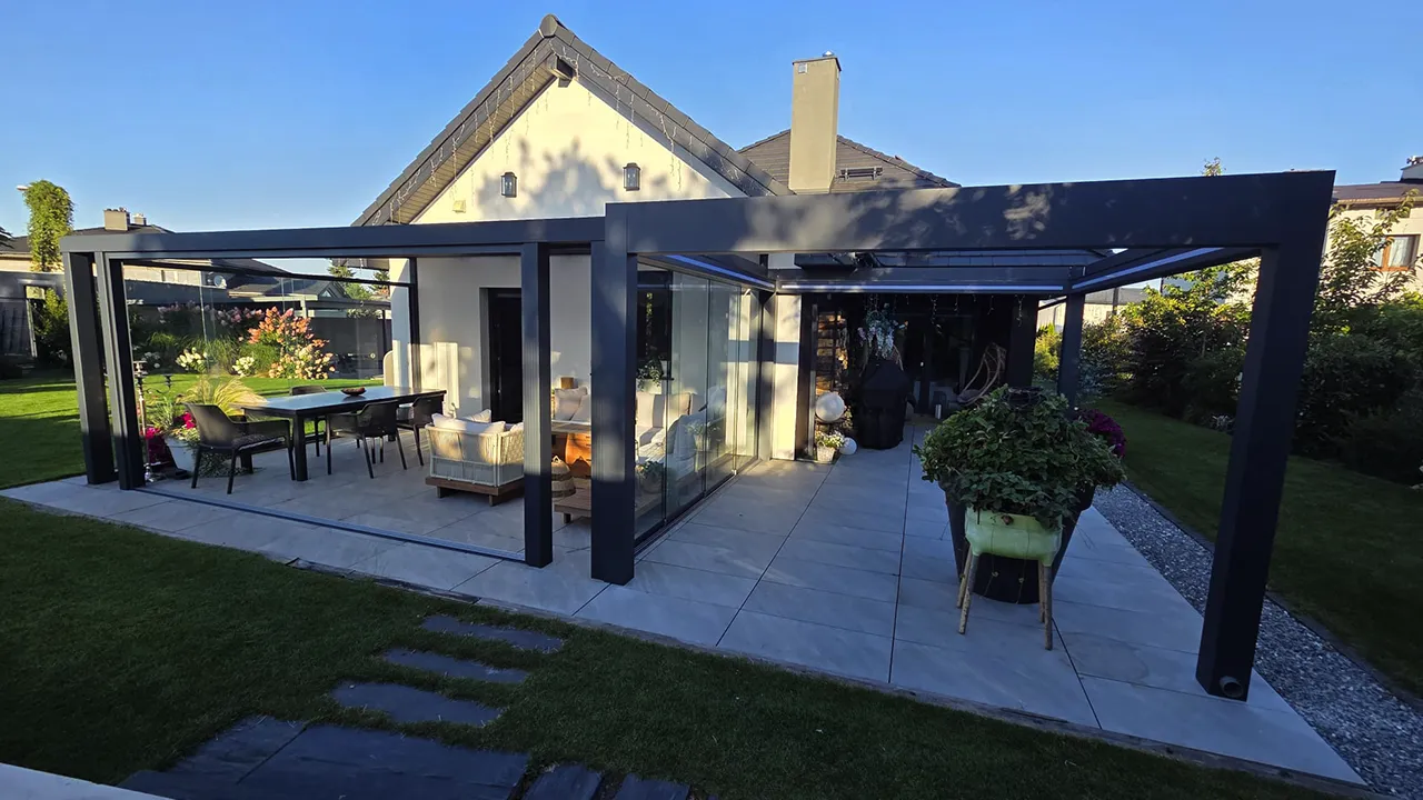 Jeśli masz sąsiadów blisko, pergola z bocznymi roletami daje Ci trochę oddechu. Tworzysz własny, zamknięty kawałek przestrzeni.